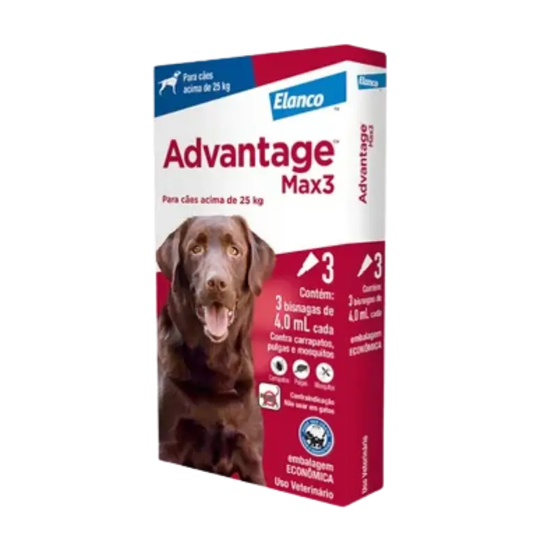 Advantage™ Max3 é um antiparasitário tópico para cães que expulsa e mata pulgas, carrapatos e piolhos, além de controlar a infestação proveniente do ambiente. Este produto também repele mosquitos, prevenindo que seu animal seja picado pelos transmissores de doenças como a leishmaniose e a dirofilariose (verme do coração).