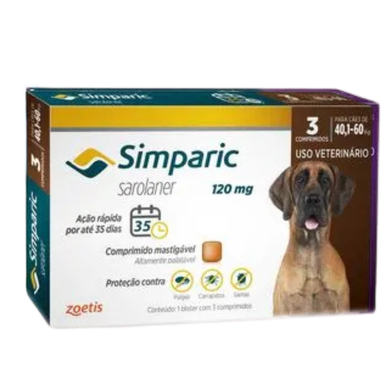 Os tutores que se interessarem pelo antipulgas da Zoetis vão se deparar com seis versões do remédio, uma para cada peso corpóreo do animal. No caso deste Simparic de 120mg, ele é indicado aos cães de porte gigante que pesam entre 40,1 a 60kg.