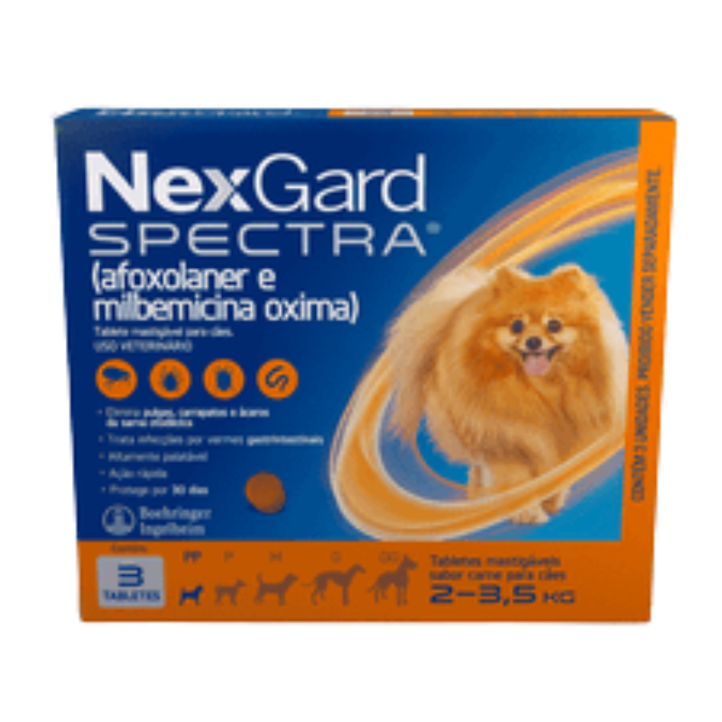 O NexGard Spectra é a solução completa, rápida e eficaz no combate a parasitas nos cães. Apesar dos cuidados diários, ataques de parasitas podem acometer o seu animal em alguma fase da vida. O NexGard Spectra PP é ideal para cães de porte mini com peso entre 2kg e 3,5kg, (não pode ser dado a cães com menos de 2kg) e protege contra: