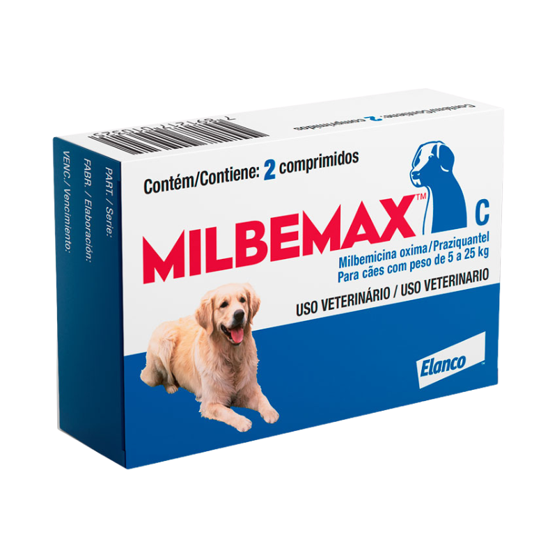 O Milbemax C para cães de 5 a 25kg trata e controla as infecções intestinais em cães por vermes redondos e chatos, das espécies: ancylostoma caninum, toxocara canis, toxascaris leonina, trichuris vulpis, dipylidium caninum, taenia spp, ecchinococcus spp e mesocestoides spp. Também age na prevenção contra a dirofilariose canina, o verme do coração.