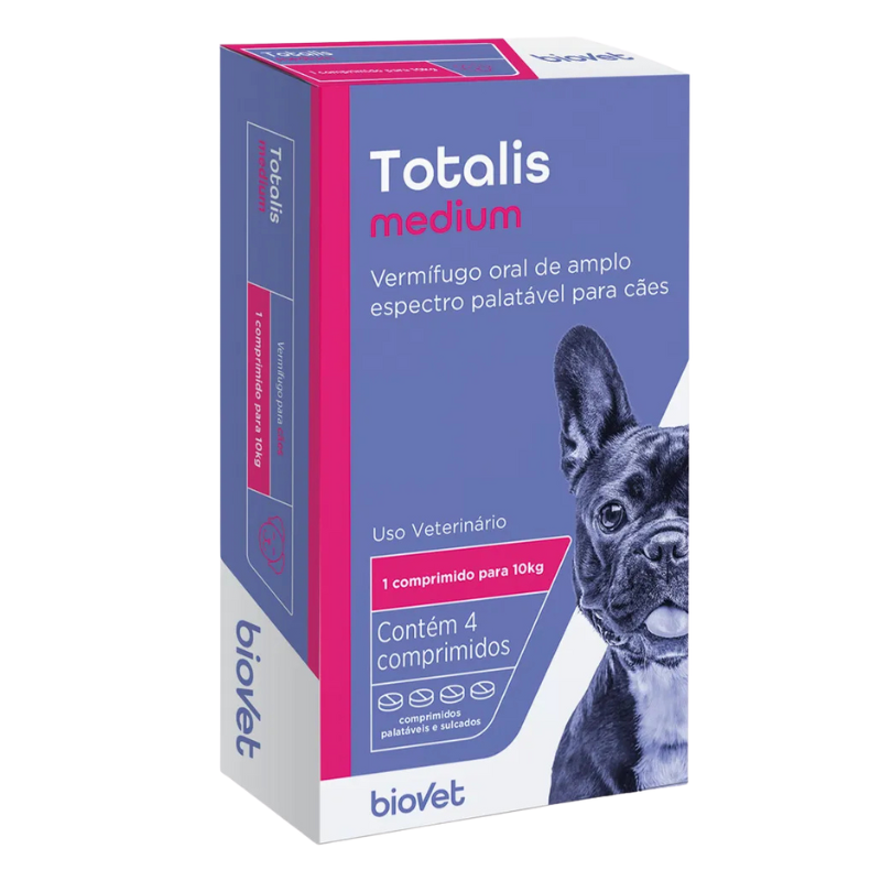 Totalis Medium é um vermífugo de amplo espectro indicado para tratamento de cães parasitados e também para prevenção das principais verminoses que acometem cães. Apresenta a formulação mais completa do mercado e comprimidos sulcados que facilitam a divisão para oferecer doses precisas de acordo com o peso corporal do cão.